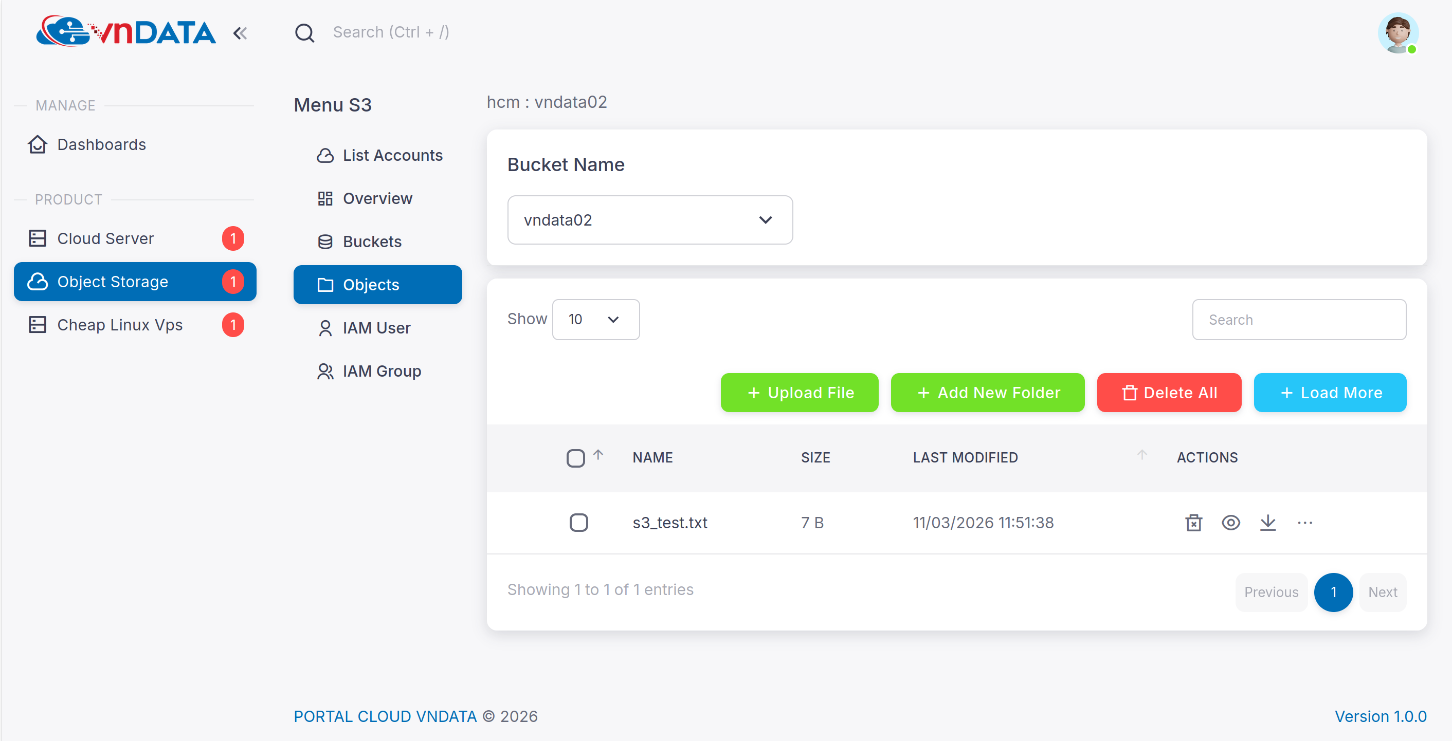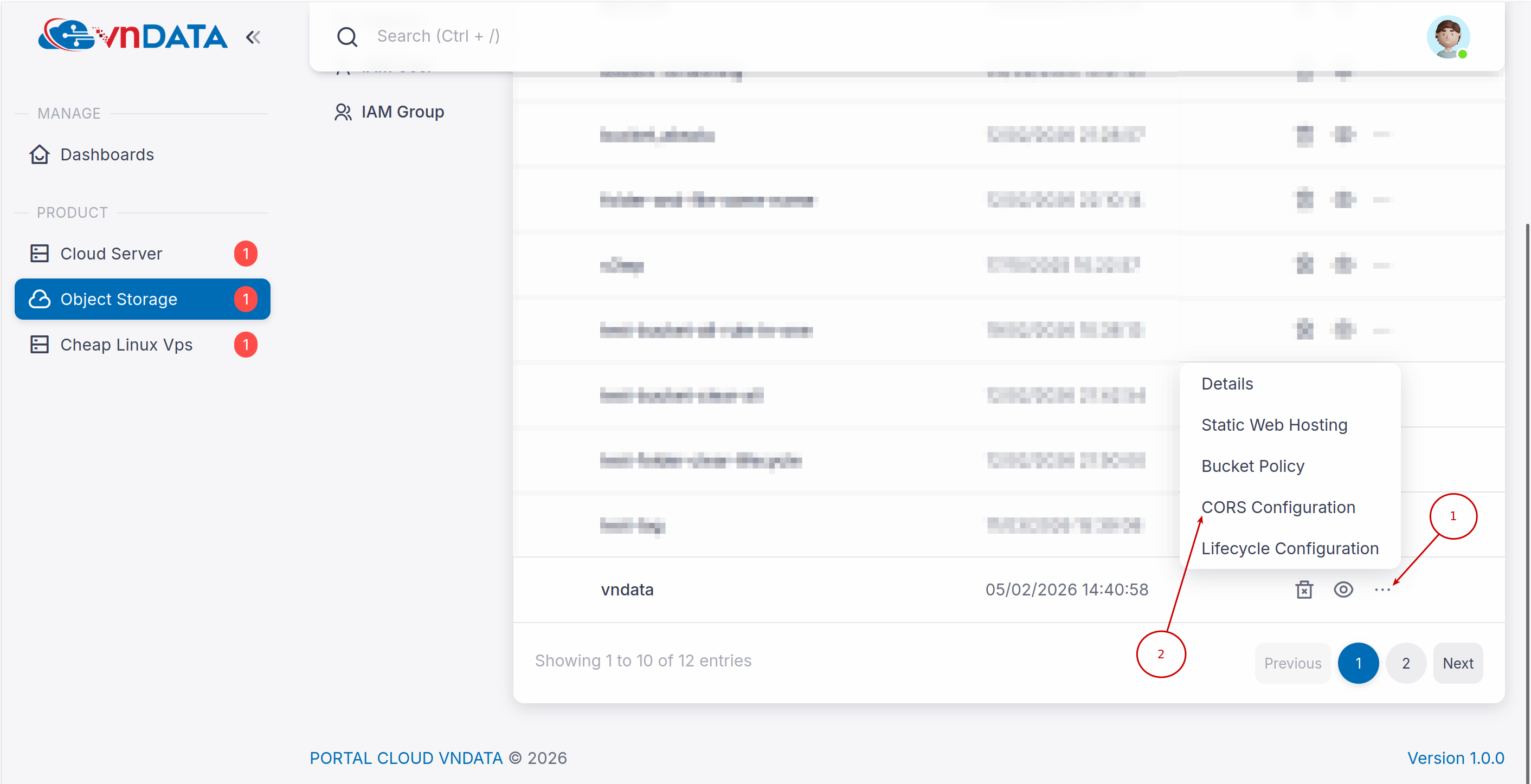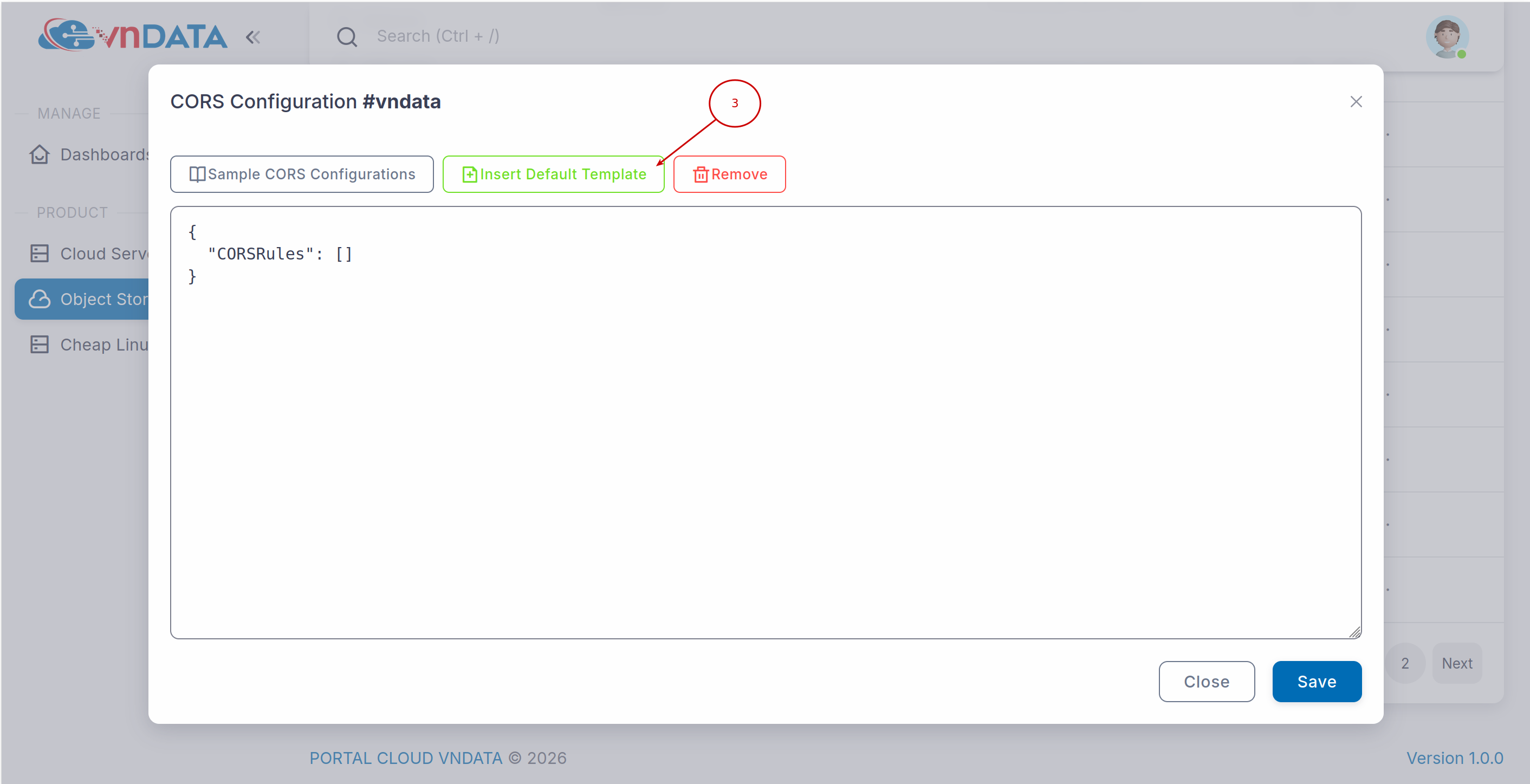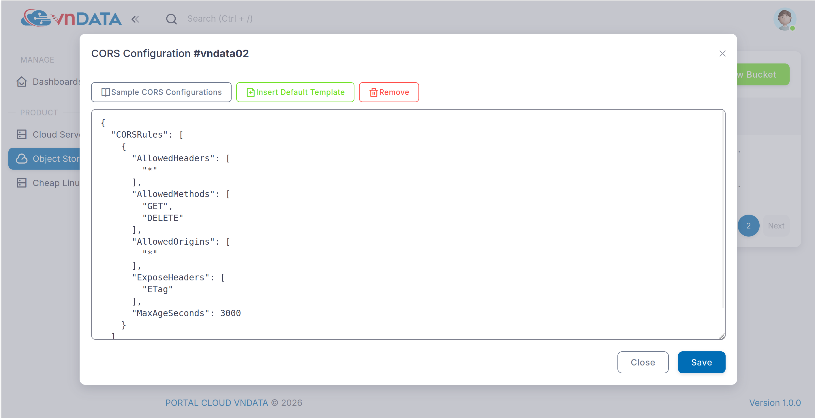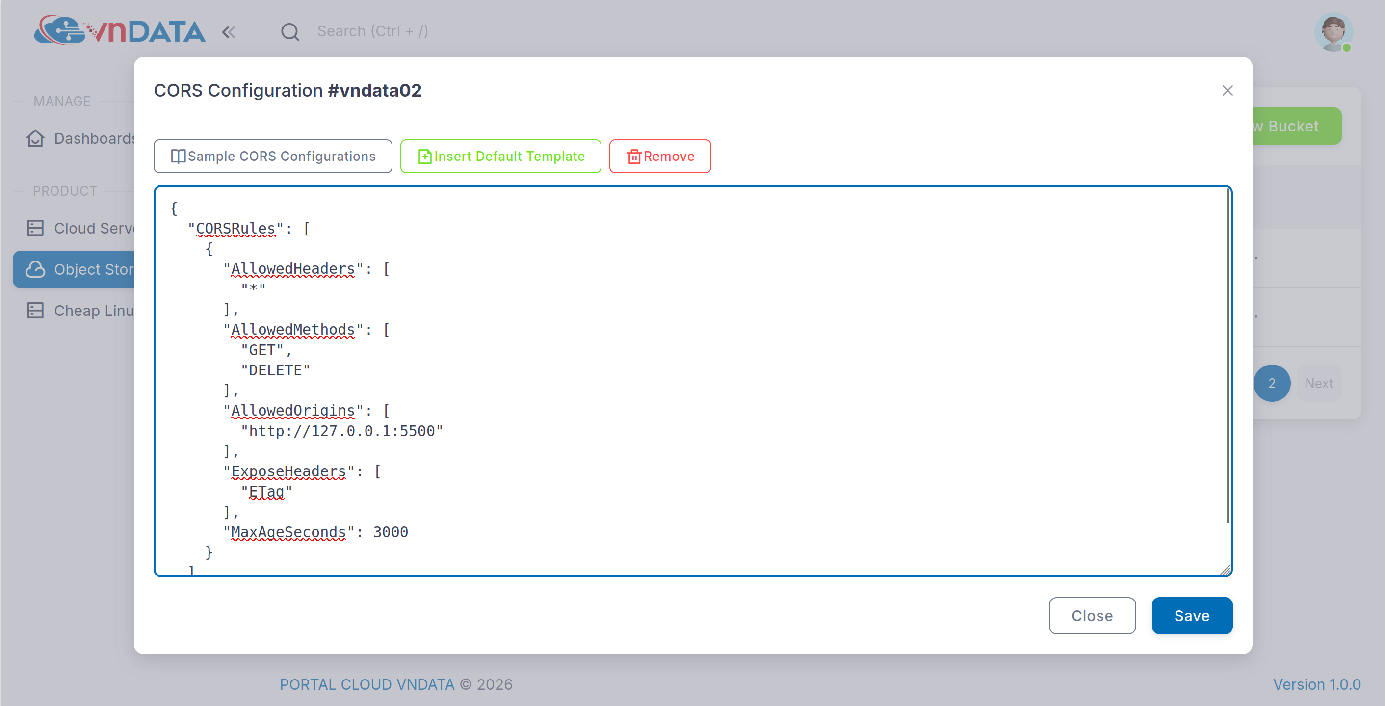 http:// hoặc https://).http://localhost:3000)./ ở cuối URL. (Ví dụ: đúng: https://vndata.vn, sai: https://vndata.vn/).* (Cho phép tất cả): Khi điền là ["*"], bất kỳ website nào cũng có thể gọi API tới file nằm trong bucket.* làm tiền tố: Có thể dùng * để đại diện cho tất cả subdomain. Ví dụ: https://*.vndata.vn sẽ cho phép cả app.vndata.vn và api.vndata.vn (Lưu ý: Chỉ cho phép 1 dấu * trong chuỗi).AllowedOrigins, thì AllowedMethods sẽ quy định các phương thức HTTP mà website đó được phép thực thi lên các file trong Bucket S3.Trường hợp 1: Đối với AllowedMethods