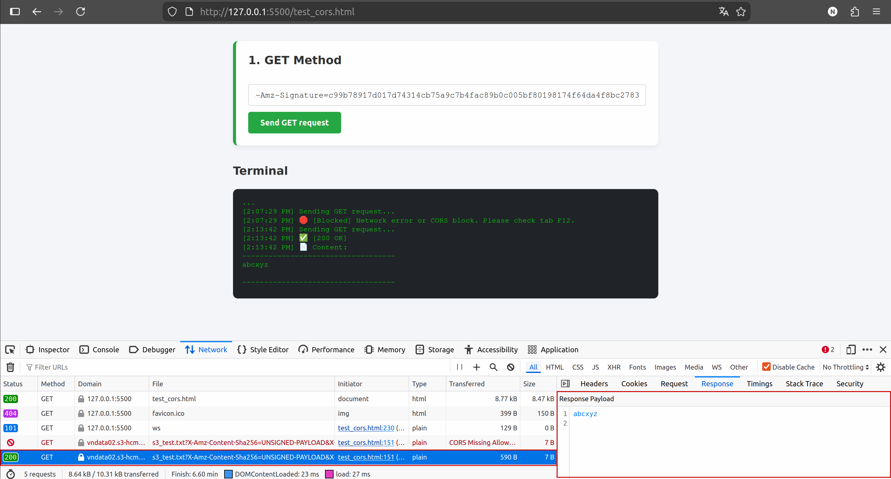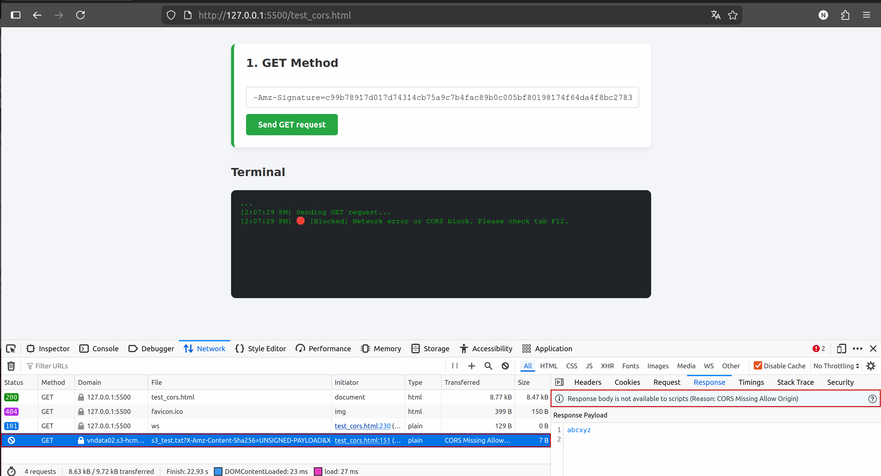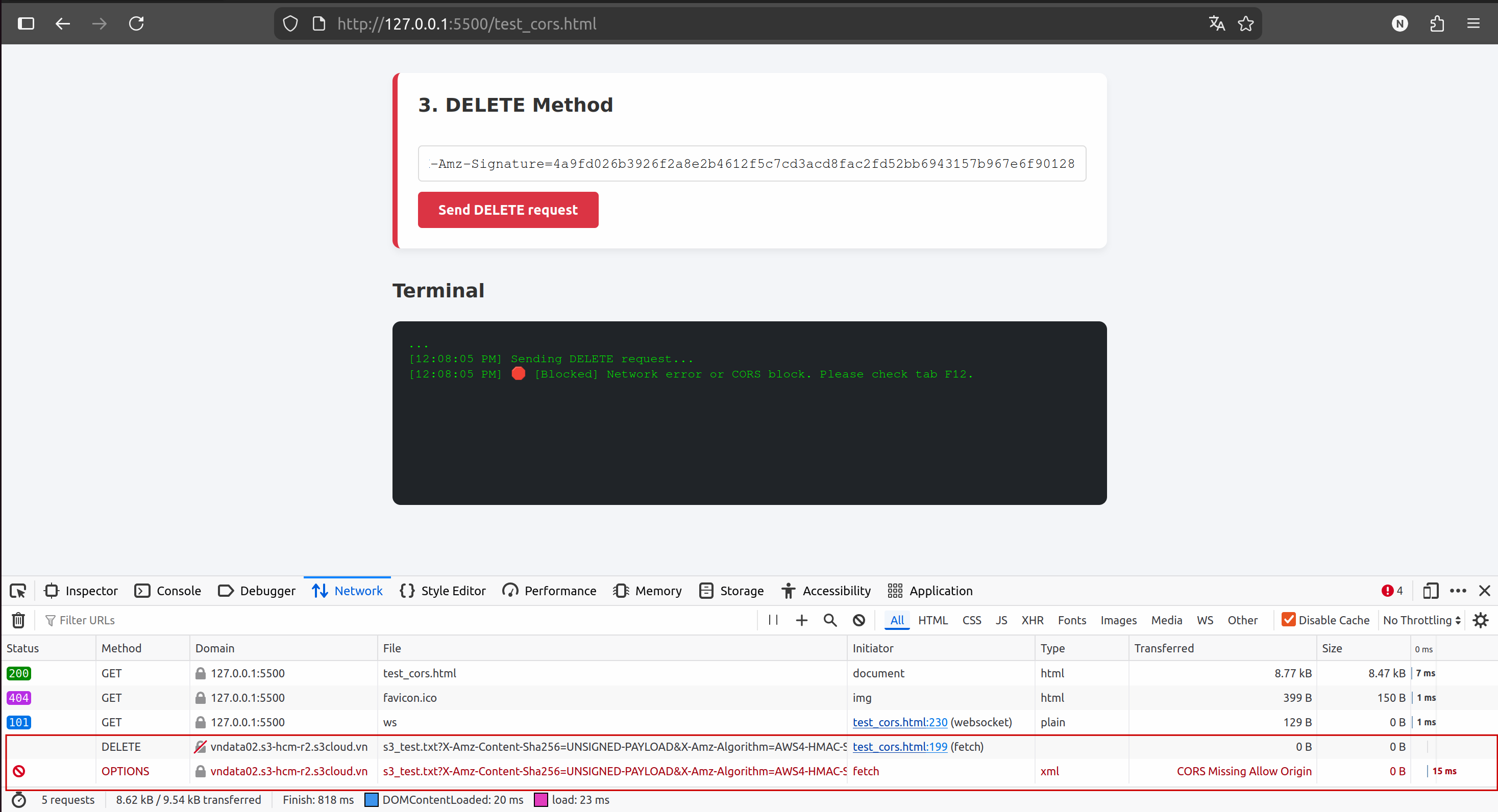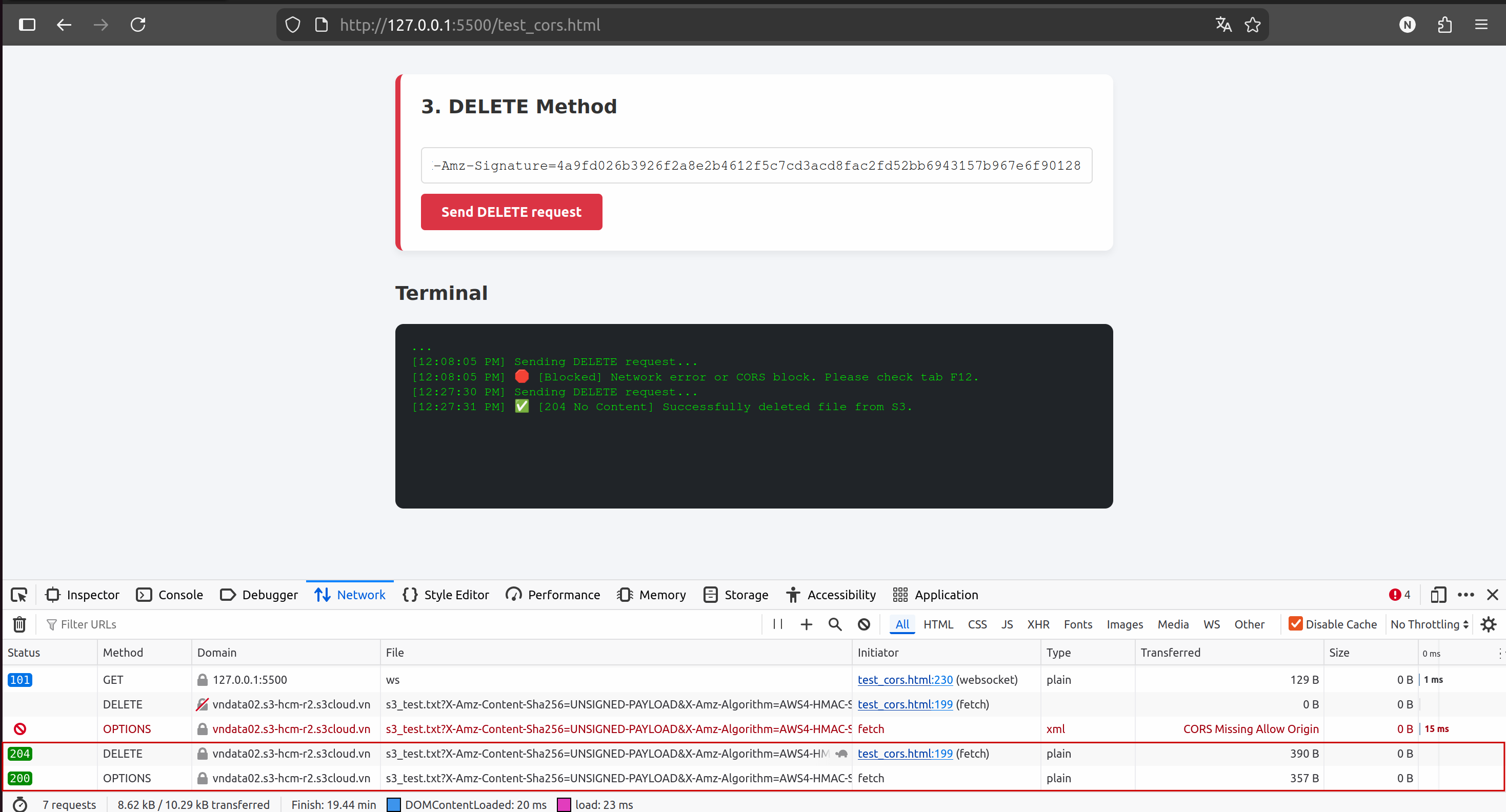 Lưu ý: Do ở bước cấu hình CORS chưa cấp quyền cho phương thức DELETE, trình duyệt sẽ chặn và báo lỗi khi gửi request này.
